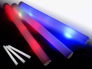 Bâton lumineux en mousse, certifications CE et ROHS, avec 3 LEDs à l'intérieur, 3 fonctions lumineuses: 1 fixe et 2 clignotantes, fonctionne avec 3 piles AG13 fournies. Longueur 48 x 4 cm.