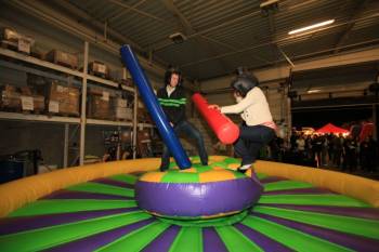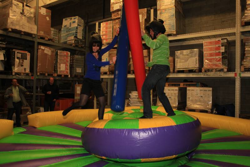 Cette structure gonflable pour adulte a pour thème le combat entre gladiateur. Le but est de rester le plus longtemps sur la plateforme du milieu en faisant tomber son adversaire.
