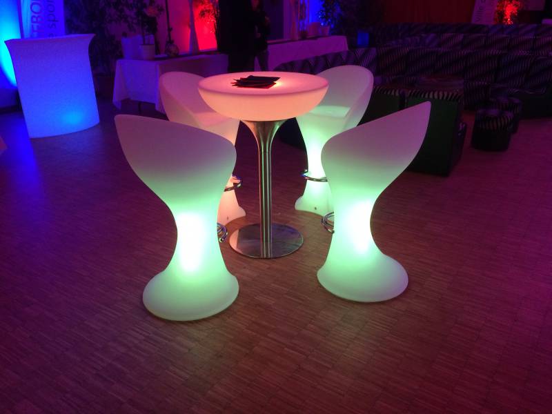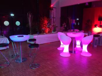 Pour un effet design le mobilier lumineux donne le petit plus à vos événements de jour comme de nuit. Les tables hautes permettent a vos invités de s'installer convenablement.